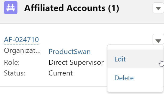2. Scroll to their "Affiliated Accounts" and click on the dropdown arrow next to the affiliation that connects the contact to the account. Select Edit.