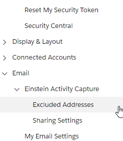 2. In the menu that appears to the left, select Email, Einstein Activity Capture, then Excluded Addresses.
